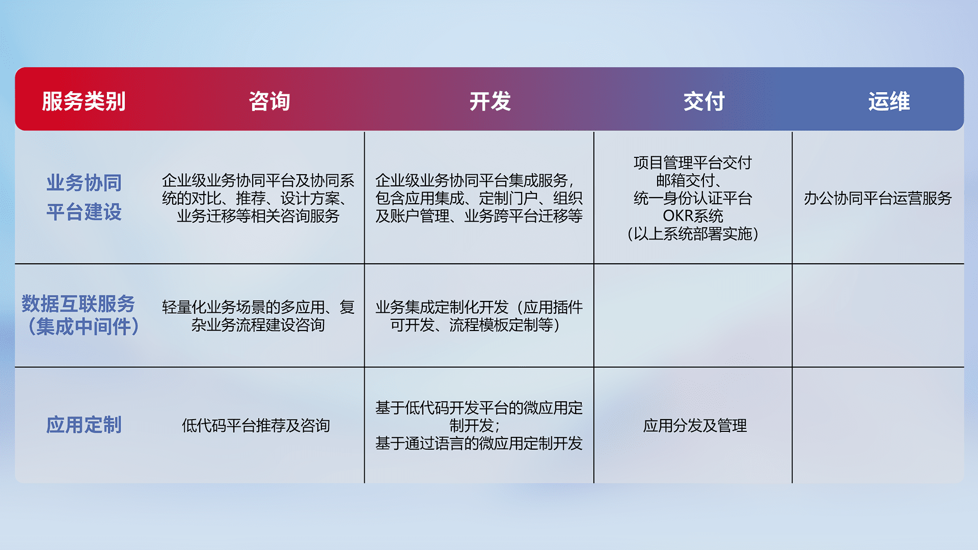 针对钉钉、、企微、、IDaas等平台级产品提供产品的规划、、、方案、、、交付、、、、定制化开发等服务,,,,实现如统一协同办公、、智能客户服务、、混合会议管理、、、智能数据查询、、、、等业务场景,,,,实现数字化转型。。。