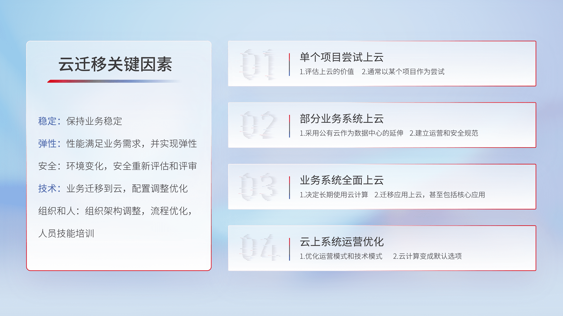 结合实际业务,,,从规划设计、、、、云平台选型、、云原生改造、、、数据迁移、、集成交付,,,,迁移全过程为客户识别最佳上云路径,,做好风险识别管理,,,设计网络架构、、身份权限、、安全审计合规、、、、操作审计、、、日志审计、、监控告警策略、、、、多站点容灾设计等,,,对云上基础设施进行整体规划,,,提升IT治理水平,,,以满足弹性、、、高可用、、、高性能的需求。。。。