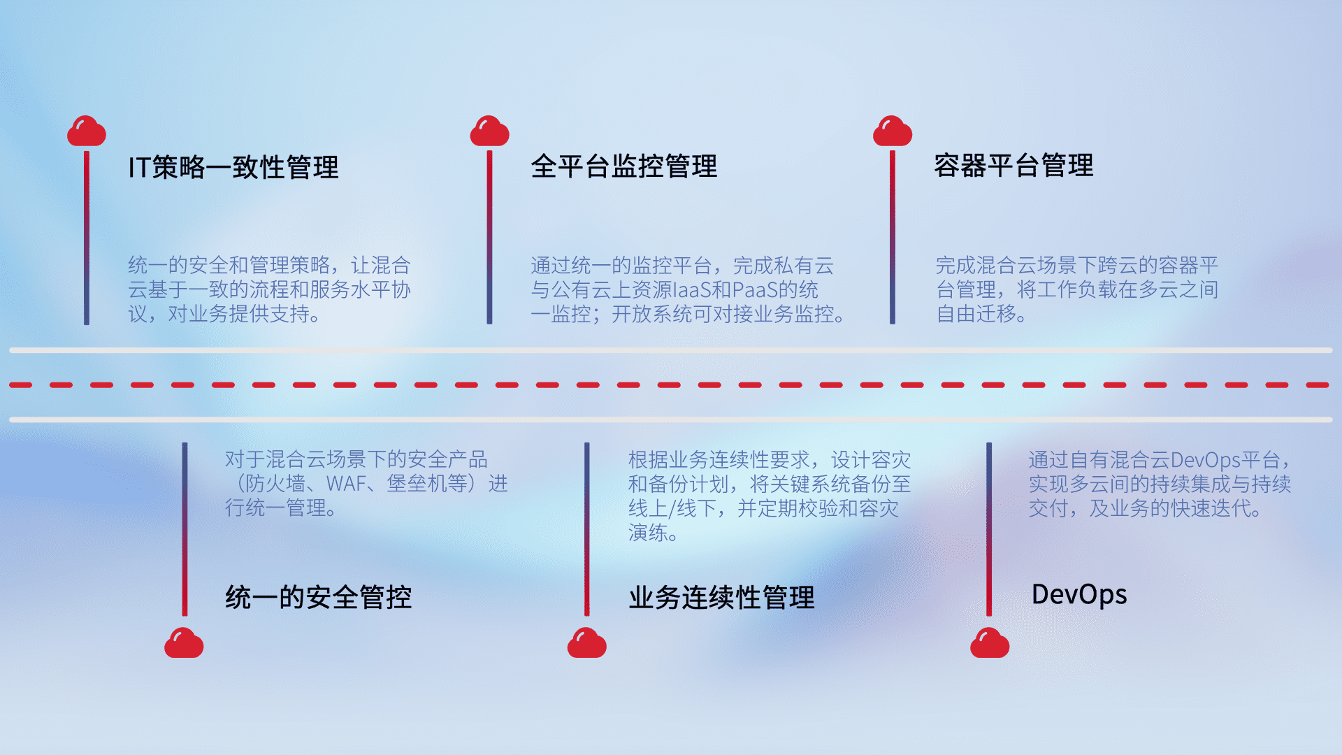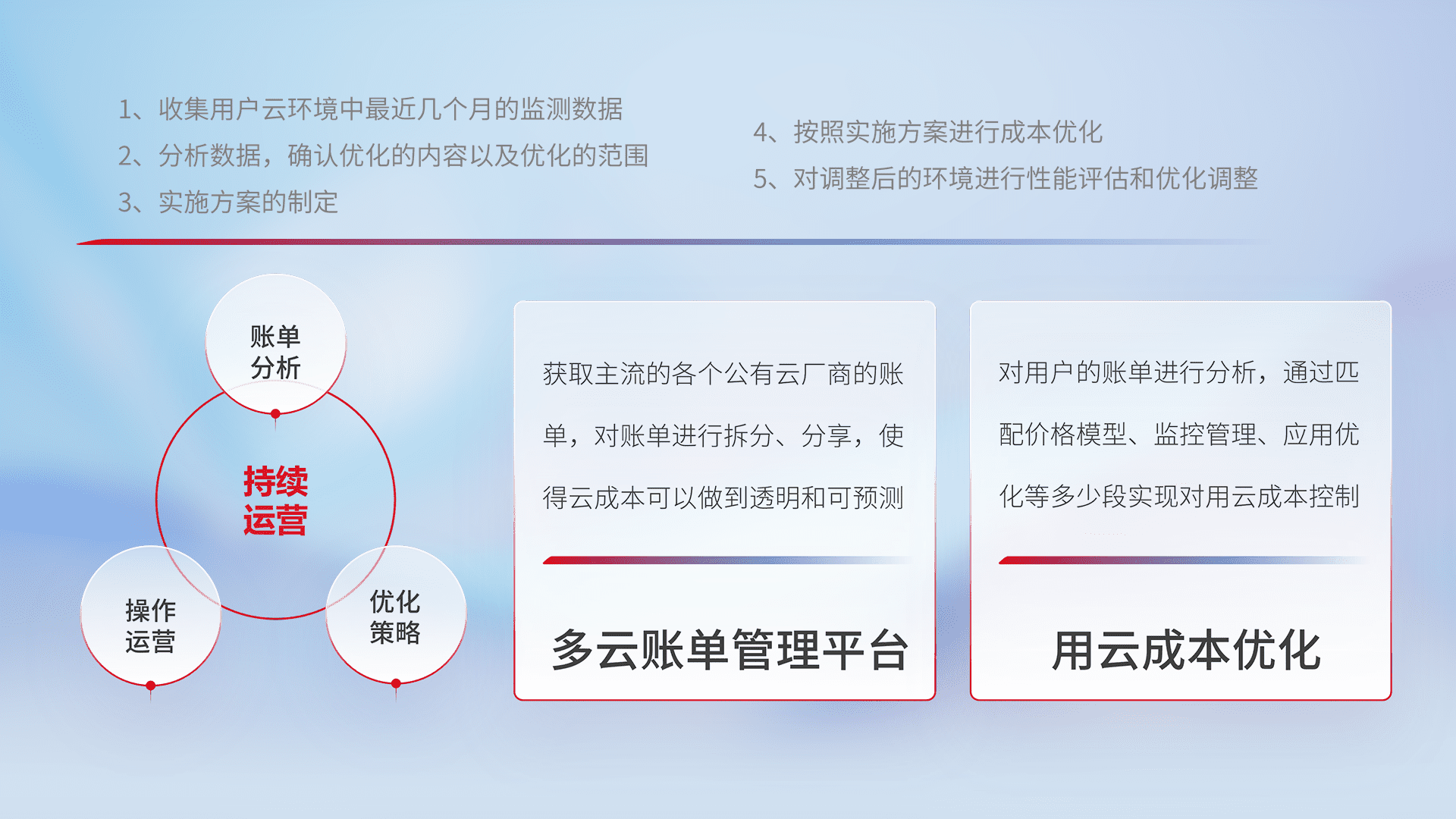 通过多云纳管,,,以统一的资源数据模型把客户的云资源进行抽象和封装,,进而实现对多云资源的统一操作,,保障云资源管理的可靠性、、、稳定性与可用性。。。量身定制化运维内容,,,配置、、开发运维、、、补丁管理、、、、备份、、、监控、、、认证和访问管理、、、审计和日常巡检等,,,,保障在用云过程中的可靠度,,,,稳定度以及高可用率。。。。
