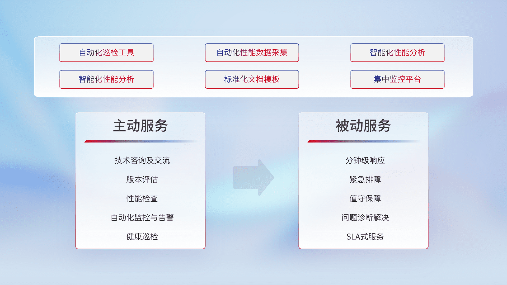 智能化工具和标准化文档,,保障服务质量,,提供主动服务(包含技术咨询、、版本评估、、、性能检查、、、、自动化监控与告警、、健康巡检)和被动服务包含(分钟级响应、、紧急排障、、、、值守保障、、、、问题诊断解决、、、SLA服务)。。